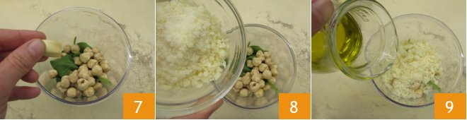the peeled whole clove of garlic 7, and the grated cheese 8. Lastly, pour the oil 9 and blend with an immersion blender.