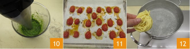 You should obtain a homogeneous and creamy consistency 10, then adjust the salt and set aside. Meanwhile, the cherry tomatoes will be cooked, remove them from the oven and let them cool slightly 11. Cook the pasta al dente, following the times indicated on the package 12.