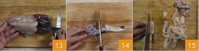Then remove the outer skin by making a small incision with a knife and pulling it away with the knife tip 13. Take the tentacles you set aside and separate them from the head by cutting just below the eyes with a small knife 14. Remove the central beak by pushing it with your hands and divide the tentacles in half. Then cut the mantle into rings about 3/4 inch thick 15.