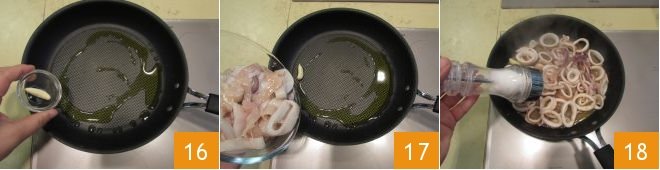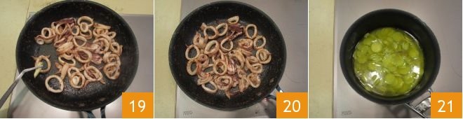 Pour a drizzle of oil into a saucepan, add the peeled garlic clove 16 and let it brown. Pour in the squid and increase the heat 17, add salt 18