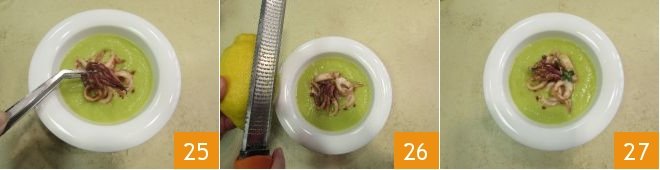 blend them with an immersion blender 22 until you obtain a smooth cream 23. Then transfer some of it onto a plate 24,