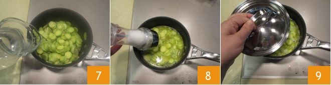 add the water 7, season with salt 8, cover with a lid 9, and let it cook gently for 20 minutes 9.