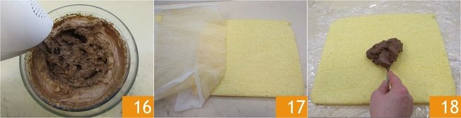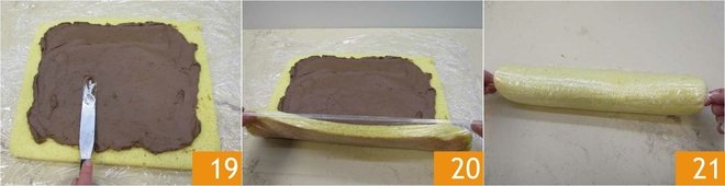 and spread it out, leaving 2 cm (about 0.8 inches) from the edges 19. Roll up the sponge cake delicately, helping yourself with the plastic wrap 20, seal the ends, and place the roll to set in the fridge for about 1 hour together with the remaining ganache 21.