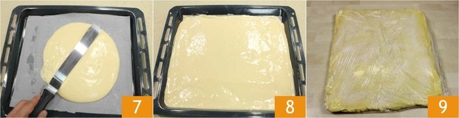 Spread the mixture on a sheet of parchment paper placed on a baking tray measuring 45 x 37 cm (about 18 x 14.5 inches), level it with a spatula 7 until reaching a thickness of 1 cm (about 0.4 inches) 8. Bake in a preheated static oven at 220°C (428°F) for 6-7 minutes. When it's ready, place it with the parchment paper on a work surface. Sprinkle the surface of the sponge cake with granulated sugar to prevent sticking, then seal it with plastic wrap, wrapping it underneath the edges as well; let it cool 9.