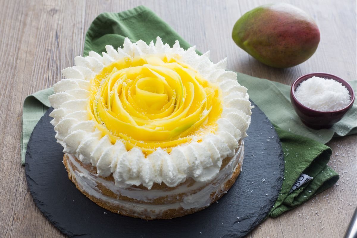 Cover the surface with whipped cream 28 and place the cake in the refrigerator while you peel the mango and slice it thinly using a vegetable peeler 29. Now you can move on to decoration: create a rose by placing the mango slices starting from the center and reaching about 1 to 1 1/4 inches from the edge of the cake 30.