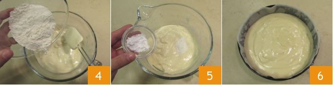 Add the all-purpose flour 4 and the previously sifted potato starch 5 and mix gently with a spatula from bottom to top so as not to deflate the mixture. Pour the obtained batter into a round 9-inch diameter mold that you have previously buttered or lined with parchment paper 6 and bake in a preheated static oven at 350°F for 30 minutes. Once baked, flip the sponge cake over a wire rack and let it cool completely.