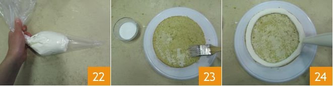 In a separate bowl, also whip the cream you will use for decoration and transfer about half of it into a piping bag without a nozzle. At this point, you are ready to assemble the cake: place the first sponge cake disc on a turntable and brush it with coconut milk 23, then create a border of whipped cream using the piping bag 24.