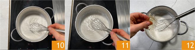 Move on to the coconut cream: soak the gelatin in cold water 7. Mix the rice flour and sugar in a saucepan 8, then pour in the coconut milk while whisking to prevent lumps 9.
