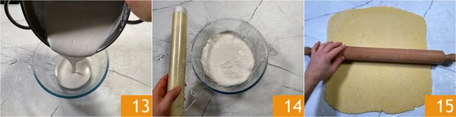 Pour the cream into a bowl 13, cover with plastic wrap directly on the surface and let cool in the refrigerator for at least one hour 14. After the pastry's resting time, roll it out to about 3/16 inch (0.20 in) thickness on a lightly floured surface 15.