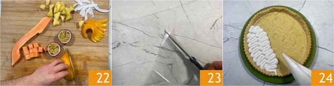 Move on to decorating: clean the fruit, then cut: the pineapple into triangles, the papaya into cubes, the coconut into thin slices with a vegetable peeler and the mango into thin strips 22. Cut the tip of a piping bag on the diagonal 23 and fill it with the cold coconut cream. Then fill the tart base with the cream, creating a decorative pattern 24.