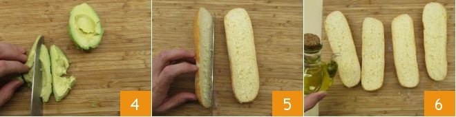 Cut it into slices 4. Take the baguettes and cut them in half 5; drizzle them with a little olive oil 6.