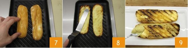 Toast the bread on a hot grill for 2 minutes on the crumb side 7 and about 1 minute on the outer side 8. Transfer to a cutting board (or serving plate) and spread mustard on one of the halves 9,