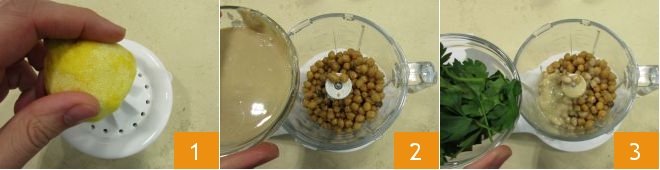 To prepare the tuna fillets with tahini and hummus, start by making the hummus: squeeze the lemon 1 and strain the juice. Pour the pre-cooked chickpeas into the bowl of a mixer with blades, add 2 tbsp of tahini 2, and season with parsley 3