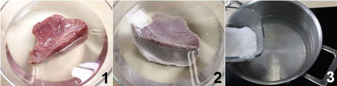 To prepare tuna in oil, start by placing the raw tuna steak in a bowl containing cold water, rinse it repeatedly so it loses all the blood to prevent it from coagulating during cooking and forming unsightly dark lumps 1. Repeat the operation, changing the water until it is clear and the tuna is completely blood-free 2. Separately, bring a large pot of water and salt to a boil 3,