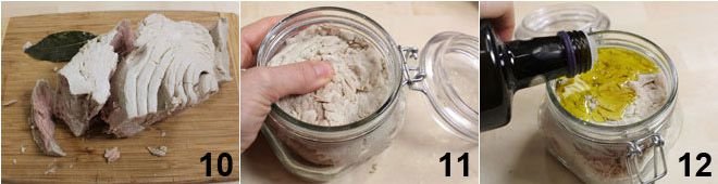 Coarsely break the tuna into pieces 10 and place it in the jars, pressing well with your hands 11. Cover it with extra virgin olive oil, taking care to cover the tuna completely but leaving 0.4 inches from the jar's rim 12 and,