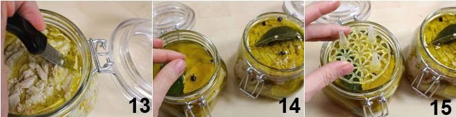 with the help of a knife, shred the tuna to ensure it is completely soaked in oil 13. On the surface of each jar, place 3 juniper berries and a bay leaf 14, then seal tightly by inserting the special plastic press as seen in the photo 15; this will keep the tuna pressed down (if you do not have the presses, you can omit them).