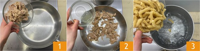 To prepare tuna pasta in white sauce, first, place the well-drained tuna in a pan 1, heat it for a few minutes over low heat, and add the lemon juice 2. Cook the pasta in plenty of salted boiling water 3.