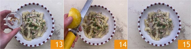 Finish with dried chili pepper 13 and lemon zest 14. Your tuna pasta in white sauce is ready to be enjoyed 15.