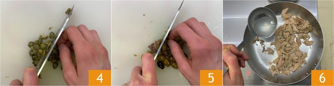 Meanwhile, chop the capers 4 and olives 5 with a knife. Add a ladle of pasta cooking water to the pan 6.