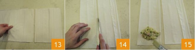Now take the phyllo dough and gently separate the sheets 13: layer 2 sheets at a time to create 5 rectangles made of double layers. Divide each rectangle in half lengthwise 14, giving you 10 strips to fill. Take a spoonful of the potato and tuna mixture and place it at the base of each strip, then brush the sides with some water 15