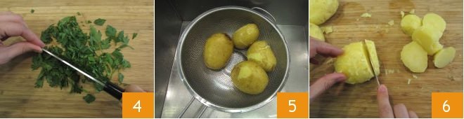 then wash and chop the parsley 4. Once the potatoes are cooked, drain them 5, peel them, and cut them into chunks 6.