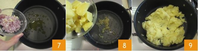 Now, heat a tablespoon of oil in a pan, add the chopped garlic and shallot 7, and sauté over medium heat for about 10 minutes, using some of the potato cooking water if necessary to prevent burning. Once the sauté is translucent, add the boiled potatoes 8, season with salt and pepper, and stir for about 5 minutes to dry them from excess water, achieving a soft and compact consistency 9.