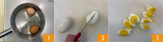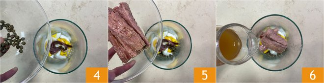 To prepare the tuna sauce, start by making the meat broth. Then, cook the eggs: in a small pot, place the fresh eggs in cold water (enough to cover them) 1, then turn on the heat and, from the point of boiling, cook for 9 minutes. Once ready, cool them under running cold water before peeling. Then cut them into 4 parts 2 3. Desalt the capers by rinsing them thoroughly under running water.
