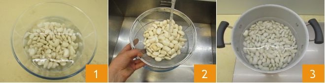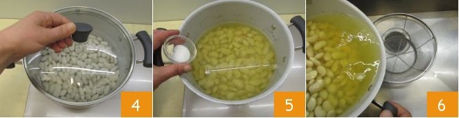 Cook the beans for 50 minutes with a lid 4, checking the cooking from time to time: the beans should be tender, but not mushy. When there are 3 or 4 minutes left until the end of cooking, add the salt 5. Once the beans are cooked, drain them well 6 and let them cool.