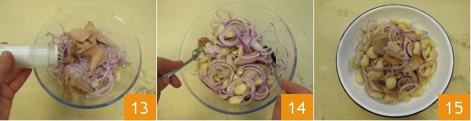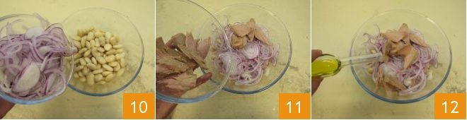 pour the now-cooled beans into a large bowl, add the onion 10 and the drained tuna 11. Season with extra virgin olive oil 12,