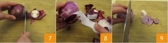 Move on to the Tropea onion: cut off the ends 7, peel it 8, and slice it very thinly 9. If you prefer a more delicate onion flavor, you can soak it in cold water for at least 1 hour (preferably several hours); otherwise, proceed with the recipe.