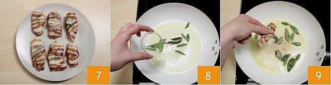 Continue like this until all the turkey chunks are covered. Put the butter in a non-stick pan and let it melt along with a dash of oil, so the butter doesn't burn, add about ten sage leaves 8 and let them brown for a couple of minutes on low heat so that they don't burn. At this point, add the turkey bites to the pan 9,
