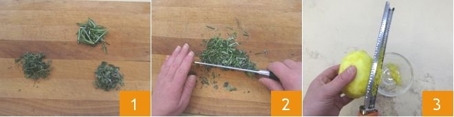 To prepare the turkey with herbs and exotic salad, start by preparing the marinade for the turkey breast. Place thyme, marjoram, and rosemary on a cutting board 1 and finely chop them 2. Then grate the zest of half a lemon 3