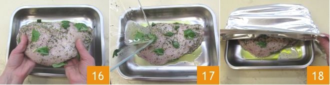 And place the marinated turkey on it 16, pouring the marinade over it 17. Seal the tray with a sheet of aluminum foil 18 and bake in a preheated static oven at 392°F for 35-40 minutes.