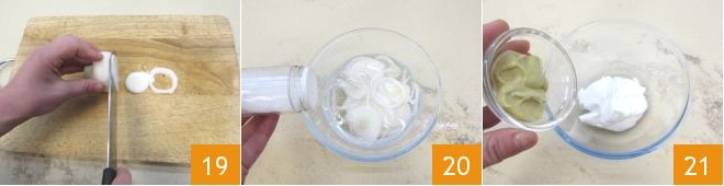 While the turkey is cooking, prepare the salad. Cut the spring onion into rings 19, and soak the slices obtained in a bowl with cold water and salt for about 30 minutes 20, to make them more digestible as you will use them raw. Prepare the sauce: in a small bowl, place the yogurt, mustard 21