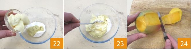 And the mayonnaise 22, and mix to obtain a homogeneous sauce 23. Return to the salad: peel the mango 24,