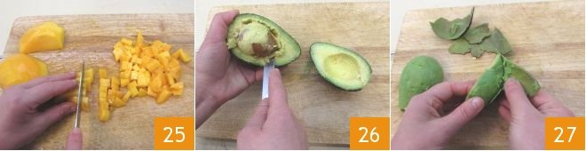 remove the pit and cut the flesh into cubes 25. Do the same with the avocado: cut it in half, remove the pit 26, and peel it 27