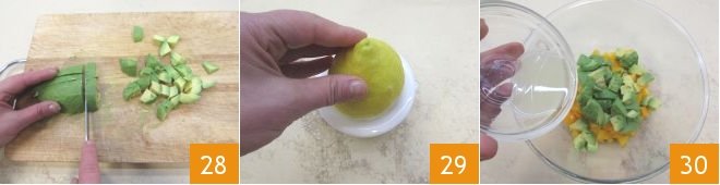 and cut the flesh into cubes 28. Squeeze the lemon to extract the juice 29 and pour it into the bowl along with the mango and avocado 30.