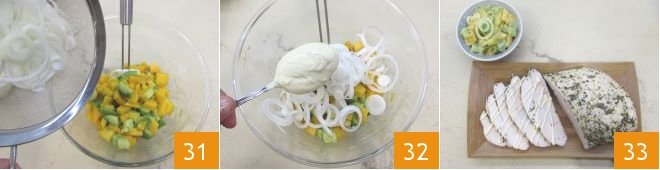 Add the drained and rinsed onion 31, and finally season with the sauce prepared earlier 32, keeping some aside to garnish the turkey slices. Serve your herb turkey in slices, sprinkled with a bit of sauce, and accompanied by the exotic salad 33.