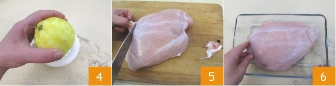 and squeeze its juice 4. Now that the ingredients are ready, proceed to clean the meat: remove the fat and cartilage 5, then take a sufficiently large baking dish and place the cleaned turkey breast in it 6.