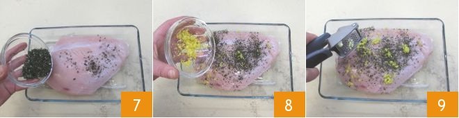 Sprinkle the top side with half of the chopped herbs 7, half of the grated zest 8, and press half of the garlic with a garlic press 9.