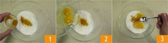 To prepare the turmeric cappellacci with butter and Grana Padano, start with the fresh pasta: in a large bowl, pour the flour, flavor with turmeric 1, add the eggs 2 and salt 3.