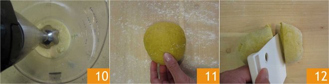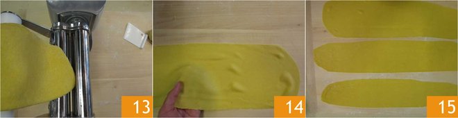 Roll it very thin with the pasta machine, passing the fresh pasta through the roller at least twice, at the penultimate step of the machine, to obtain a thickness of about a quarter inch 13. Do the same for each piece of fresh pasta 14 15.