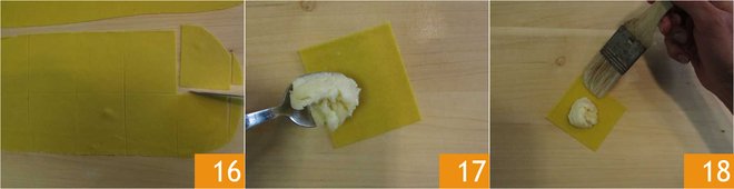 From each, cut squares of 2.5x2.5 inches 16, fill each square with half a teaspoon of Grana Padano DOP Riserva filling 17. Lightly brush the edges with water 18.