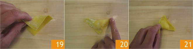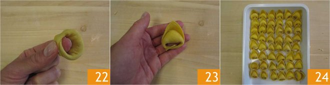 Close the cappellacci by joining the two ends 22, pressing well. Continue this way for all the others 23 24.
