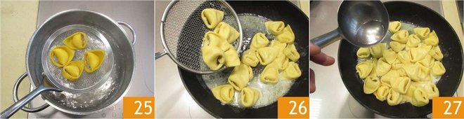 Now that they are ready, proceed to cook and season: bring plenty of water to a boil in a large saucepan and salt it at the boil. In a large pan, gently heat the butter, adding a ladle of cooking water. Cook your cappellacci in boiling salted water for about 3 minutes 25. Then drain them directly into the pan with the butter 26, add a ladle of water as needed 27.