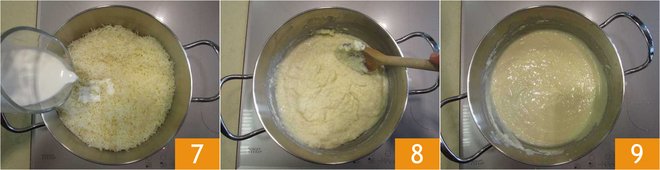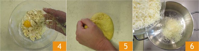 Work the ingredients by hand first in the bowl 4, then once well mixed, move to the work surface and knead until you get a smooth and homogeneous, firm dough 5. Set aside for 30 minutes at room temperature wrapped in plastic wrap. In the meantime, prepare the filling: pour the grated Grana Padano DOP Riserva into a saucepan 6.