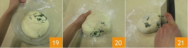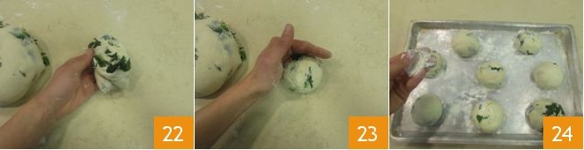 Shape each portion into a ball 22, then roll the dough on a surface 23 and place each on a baking sheet. At this point, dust the surface with a little flour 24