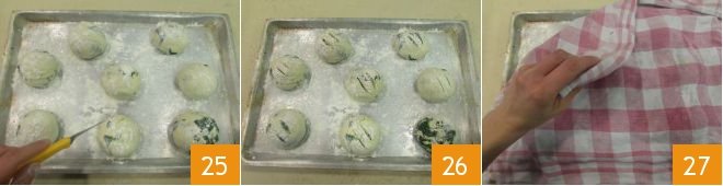 and make two cuts on the surface of each roll (25-26). Cover with a cloth 27