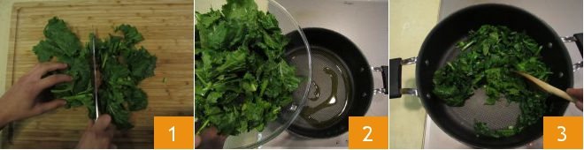 To prepare the turnip greens rolls, first wash the turnip greens, then cut them into pieces with a knife 1. Heat some oil in a pan, add the turnip greens 2 and cook them, stirring occasionally 3