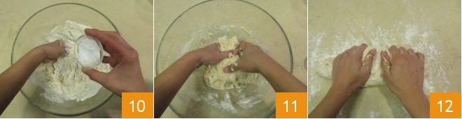 and start kneading. Before it's completely absorbed, add the salt 10. Continue working the dough 11, then transfer it to a floured surface and knead until you get a smooth ball 12.